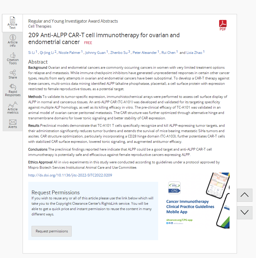 摘要標(biāo)題Anti-ALPP CAR-T cell immunotherapy for ovarian and endometrial cancer 用于人體內(nèi)卵巢癌和子宮內(nèi)膜癌的抗 ALPP CAR-T 細(xì)胞免疫療法