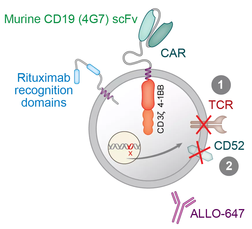 為了減少或杜絕移植物抗宿主?。℅VHD)和異基因排斥風(fēng)險(xiǎn),Allogene會(huì)對(duì)CAR-T細(xì)胞進(jìn)行基因編輯,敲除T細(xì)胞受體基因。此外,Allogene還開發(fā)了一款抗CD52單抗ALLO-647用于抑制宿主免疫系統(tǒng),以支持AlloCAR TTM的持續(xù)治療,達(dá)到充分療效。