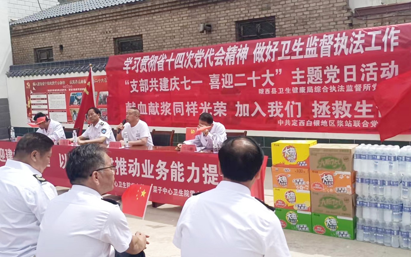 隴西縣衛(wèi)生健康局綜合執(zhí)法監(jiān)督所黨支部、定西白銀地區(qū)漿站聯(lián)合黨支部、菜子中心衛(wèi)生院黨支部和菜子中心衛(wèi)生院雪山分院黨支部,聯(lián)合開展“支部共建,慶七一,喜迎二十大”主題黨日活動。定西白銀地區(qū)漿站聯(lián)合黨支部書記任紅衛(wèi)同志做了關(guān)于“獻(xiàn)血漿、送溫暖,筑牢疫情防控防線”專題報(bào)告,為感謝所有醫(yī)務(wù)人員在抗擊疫情中的辛勤付出,特意為他們送上消暑慰問品。