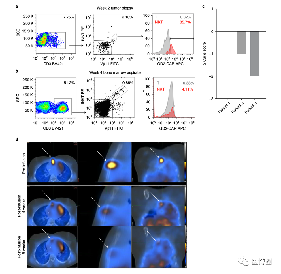 a 流式細(xì)胞圖展示了病人1在輸入細(xì)胞兩個(gè)星期后NKT細(xì)胞在整個(gè)腫瘤浸潤(rùn)淋巴細(xì)胞中的比例。柱形圖比較了CAR的表達(dá)(紅色,85.7%)和陰性對(duì)照(灰色,0.32%)